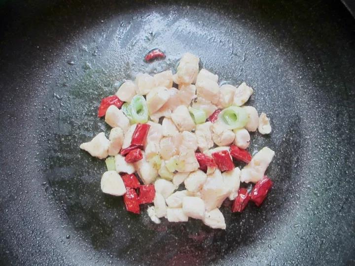 7. 雞丁肉變色,倒入青椒大火翻炒