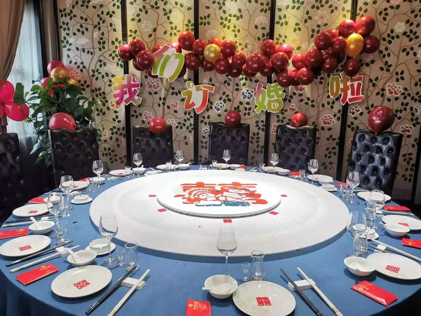 接到通知12月22日的午餐河南府包間是一家訂婚宴席,客戶要求把房間布置的漂亮些,于是我腦海里浮現(xiàn)出了美好的畫面,連忙著手開始準備布置,利用空余時間做了個紅雙喜沙畫展臺放置餐桌。接著和我們薛總一起準備房間裝飾,粘貼背景墻“我們訂婚啦”的喜宴牌子,拿出為客人特意準備的大紅色氣球裝扮房間,無論是凳子上面、窗簾上面、周圍墻壁都布置了喜慶的紅色氣球,餐桌上面點綴了紅色喜字,所有的都準備完畢,等待客人的光臨!